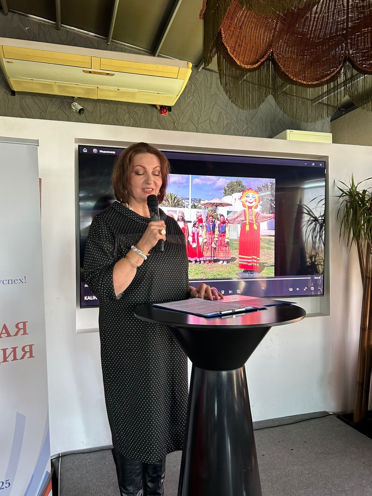 Тарасевич Елена Петровна, руководитель культурно-просветительского клуба «Калинка» (Монастир), представила результаты работы клуба, который вносит значимый вклад в сохранение русской и славянской культуры за рубежом, организуя тематические праздники и мастер-классы по народным промыслам. Среди ключевых достижений 2025 года — 1-е место в пушкинском конкурсе, участие в международных и всероссийских проектах («Женщины за сохранение традиций», фотоконкурс «Русская цивилизация», праздничные флешмобы), а также проведение международного конкурса «Сувенирный хоровод» с участием представителей из 18 стран. Клуб активно укрепляет культурные связи между Россией и Тунисом, популяризирует традиции среди диаспоры и местных жителей и вносит весомый вклад в деятельность КСОРС Туниса.